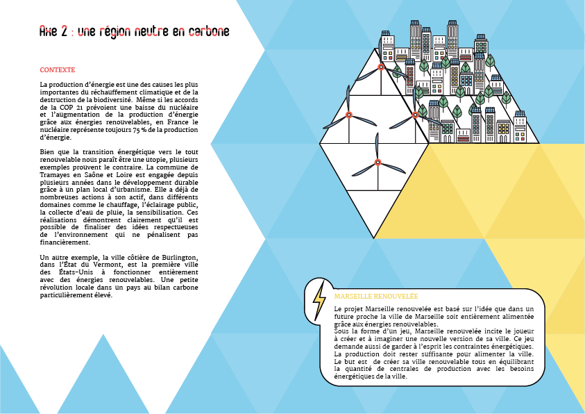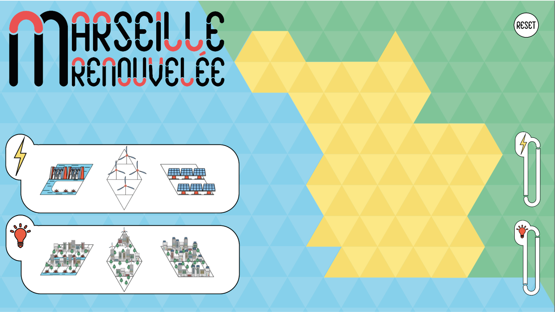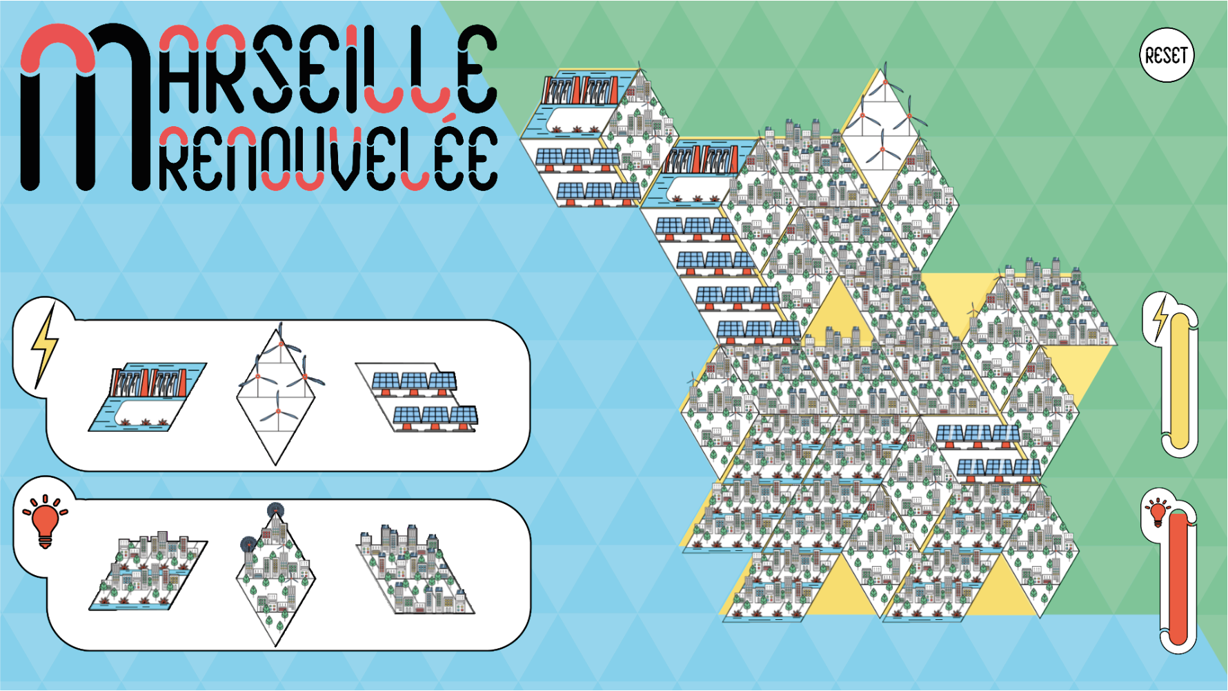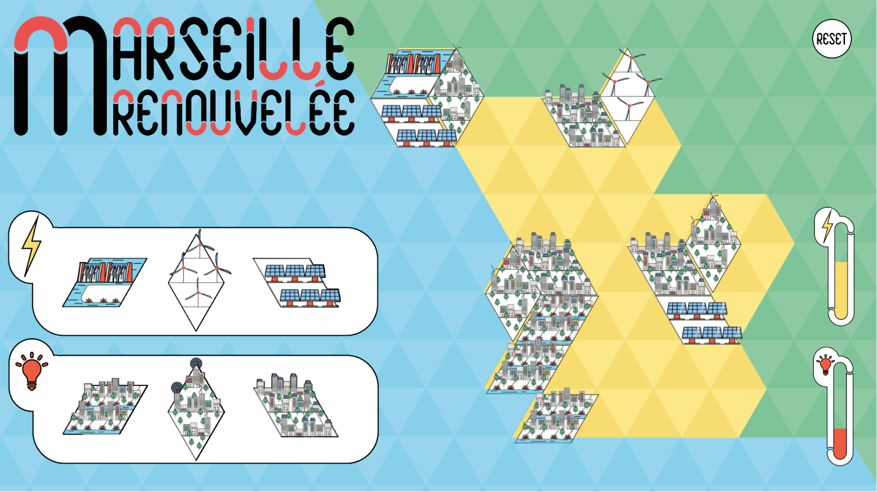 L’objectif est de recréer la ville de Marseille avec des sources d’énergies vertes en respectant le ratio entre la production et la consommation d’énergie grâce aux jauges indicatives de la consommation énergétique.